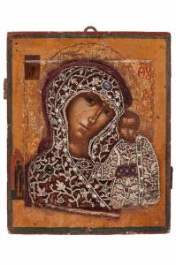 - NOTIZIE STORICO CRITICHE Sulle reali origini dell'icona della Madre di Dio di Kazan si sa pochissimo, si può solo supporre che sia stata scritta a Costantinopoli. La prima icona di questa tipologia fu rinvenuta nel XVI secolo, sepolta sotto terra, da una fanciulla di Kazan: da qui il nome con cui viene venerata. Trasportata con grande solennità nella capitale, fu collocata nella Cattedrale e fu subito oggetto di grande venerazione pe molti miracoli attribuiti alla sua intercessione. Fu lo Zar Aleksej Michajlovic, nel 1694, ad istituirne la festa il 22 ottobre, a ricordo del giorno in cui i russi, per intercessione della Kazanskaja, costrinsero i polacchi ad abbandonare la città di Mosca da loro occupata. L'icona sparì di nuovo durante la Rivoluzione russa. Nel 1950 l'Icona, ritenuta l'originale, riapparve in Occidente e passò attraverso acquirenti diversi fino a giungere in possesso (1970) della Ass. Blue Army che sarebbe dovuta essere la custode della sacra icona fin tanto che la Russia si fosse convertita. Dal 1987 la Commissione cattolica per l'ecumenismo dell'archidiocesi di Seattle si impegnò per far avere l'icona al Santo Padre, all'epoca Giovanni Paolo II, in modo che fosse lui stesso a restituirla; questo avrebbe spinto il governo sovietico a ripristinare l'antico uso della cattedrale. Iniziò allora e durò per tutto il 1990 una fitta serie di comunicazioni fra la Blue Army, il Consiglio Ecumenico di Seattle ed il Vaticano, tutte rigorosamente "Top Secret", che portarono al trasferimento dell'icona in Vaticano. Il Papa divenne il garante dell'Icona, al punto da custodirla personalmente nel suo appartamento privato. Nel 2000 Giovanni Paolo II incontrò il sindaco di Kazan, Kamil Ishkakov e nel 2003 Vladimir Putin con cui pregò davanti alla santa immagine. Il 28 agosto 2004, il papa restituisce l'icona, per mano del cardinale Walter Kasper, al patriarca di Mosca Alessio II.\nSotto l'aspetto iconografico, la Vergine di Kazan si riallaccia a una immagine mariana denominata Madre di Dio di Petr (Petrovskaja), perchè attribuita a Petr, metropolita di Russia nel 1308, noto come meraviglioso pittore di icone. Della Petrovskaja riprende le linee caratteristiche, come la figura tagliata sotto le spalle, ma nella Kazanskaja non sono visibili le mani della Vergine ed il Bambino ha la mano destra benedicente, mentre la sinistra è nascosta tra le pieghe della veste. Maria vi è ritratta a mezzo busto con il volto reclinato verso il Bambino, che si regge in piedi sulle ginocchia della Madre. \nLa nostra icona, di Scuola della Russia centrale, risale alla seconda metà del XVIII sec. La Kazanskaja è "scritta" su tavola di tiglio e dipinta a tempera all'uovo su fondo oro, lumeggiata da finissima crisografia. Nell'atteggiamento reciproco delle figure vi è un accenno al modulo della tenerezza: se infatti il Bambino è rigidamente frontale, l'inclinazione del capo di Maria è particolarmente accentuata, cosicché il suo velo sfiora il Figlio, in una posa che ricorda l'affettuoso contatto, caratteristico delle icone "della tenerezza". Il viso di Maria conserva l'espressione grave della Hodighitria bizantina, ma esprime allo stesso tempo femminile dolcezza e triste tenerezza. In cornice, a sx per l'osservatore, santa Pelagia, vestita da monaco.\nRiza in argento sbalzato e cesellato, forma una raggiera intorno alle teste di Maria e del Bambino; al centro della raggiera sono applicati, in argento non punzonato, due angeli sbalzati recanti una corona sul capo di Maria. Punzone città di Vologda, saggiatore B.B. 1856, punzone ribattuto ?? (IZ) dell'argentiere Ivan Zugyev (o Zugev) attivo a Vologda dal 1806 al 1824 (o al 1860). Vestito ricamato a ramages con perle di fiume, madreperle, cristalli blu e verdi e ametiste. Applicazione di due angeli.