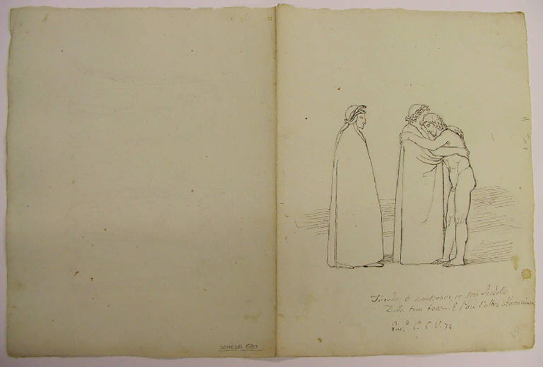 - NOTIZIE STORICO CRITICHE Vedi 671. Il disegno del recto illustra il noto episodio che si svolge nella seconda balza dell'Antipurgatorio. Quello del verso rappresenta i santi che nel Cielo Stellato esaminano Dante sulle virtù teologali.