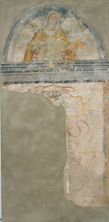 - NOTIZIE STORICO CRITICHE Il ciclo di affreschi proviene da un locale dell'antica conceria di Sondrio, detto il "Colombaro", in quanto si trattava di una vecchia torre cinquecentesca. La decorazione murale fingeva un portico architravato, sormontato da lunette nelle quali erano inserite immagini di santi ed una Crocifissione. I pilastri e l'architrave erano decorati a candelabre, motivi ornamentali piuttosto ricorrenti nelle dimore aristocratiche valtellinesi. Il ciclo era stato pensato probabilmente da un committente colto e letterato, forse un ecclesiastico, che sostituisce ai busti di eroi classici o personaggi della propria famiglia, figure di santi guerrieri e sante elegantemente vestite. La cultura del committente risulta ancor più evidente nei cartigli con iscrizioni latine che pendono, sospesi con nastri rossi, da ogni campata.