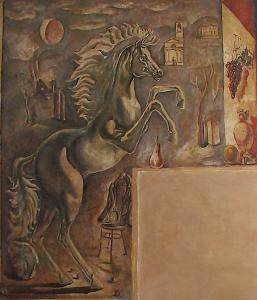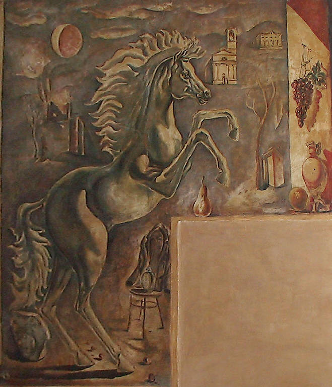 - NOTIZIE STORICO CRITICHE Il dipinto era posizionato su una parete divisoria nell'atrio dell'albergo Caval Bianco in Piazzale Bertacchi a Sondrio; a seguito dei lavori di demolizione del complesso iniziati nel 1993, si è proceduto ad uno strappo per salvare l'opera. L'immagine a tutta altezza di un cavallo in un paesaggio spicca per vigore e plasticità; il paesaggio, di sapore quasi metafisico, condensa alcuni temi quali una testa "classica", costruzioni e rovine, figure indefinite. \nSull'altra faccia della parete divisoria Livio Benetti dipinse un soggetto ornamentale.