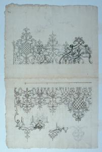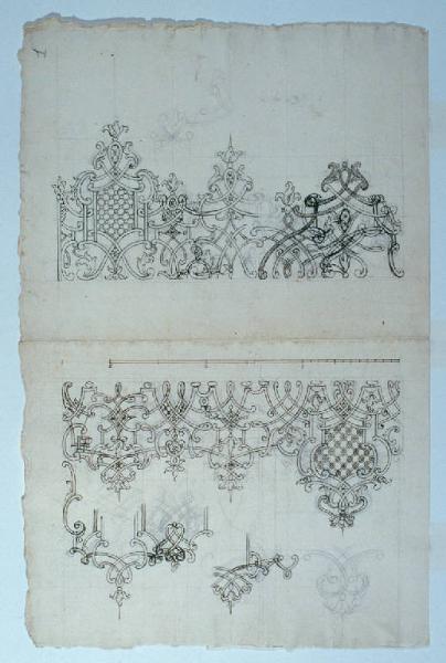 - NOTIZIE STORICO CRITICHE Il disegno sembra uno studio preparatorio per l'inferriata per le cappelle della collegiata di Sondrio (N.I.L. 16)\nNel verso del foglio sono raffigurate a schizzo due piccole piante architettoniche. La prima presenta uno spazio ottagonale con bracci a croce diseguali al cui centro è posto un altare circondato da quattro coppie di colonne. La seconda accenna una pianta longitudinale con due file di colonne. Più che un oratorio a pianta centrale, inconsueto nella tematica ligariana, lo schizzo potrebbe riferirsi ad un particolare d'altare con ciborio a tempietto (come quello schedato N.I.L. 14).