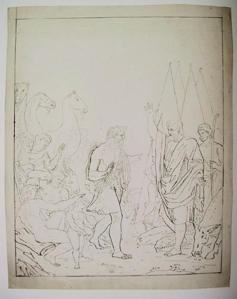 - NOTIZIE STORICO CRITICHE Il disegno rappresenta indubbiamente un episodio biblico, forse il congedo di Abramo ( a ds.) e Lot (a sin.), narrato in Gen., 13. Al disegno fa riscontro quello schedato al N.I.L. 663, con qualche variante, e con esso parte di un gruppo di scene bibliche (596, 606, 607, 614, 624, 625, 654, 655), ispirate al concetto di chiara illustrazione popolare.