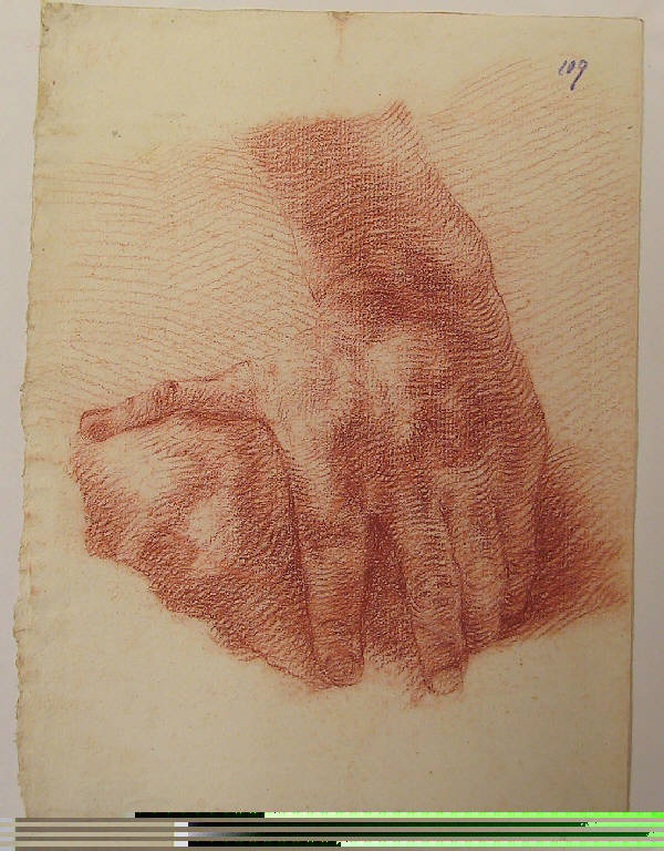 - NOTIZIE STORICO CRITICHE Questo disegno è probabilmente copiato da un rilievo di gesso (vedi le mani schedate al N.I.L. 142 e 175 riprese da diversi punti di vista).\nLo schizzo del verso sembra un lavoro didattico