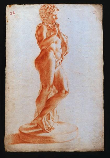 - NOTIZIE STORICO CRITICHE Per quanto il disegno sia evidentemente una copia, quindi con tutta probabilità un saggio accademico di Pietro a Roma, l'eleganza e la compiutezza dell'esecuzione ne fanno un pezzo di bravura. Il soggetto è lo stesso che appare, nella parte superiore, nel verso del disegno schedato al N.I.L. 175, ma ripreso di profilo anzichè di prospetto.