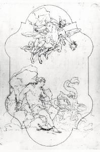 - NOTIZIE STORICO CRITICHE E' il "pensiero" per una tela da soffitto dello scalone del palazzo de Salis a Coira, l'unico disegno che si riferisca con certezza al ciclo grigione del Maestro: nel dipinto però l'asse maggiore è disposto orizzontalmente e l'equilibrio della composizione risulta alterato. E' anche il solo esempio noto di nudo femminile nei disegni ligariani. Il foglio reca nel verso conteggi per congegno d'orologio, impossibili da trascrivere (si allega fotografia), che si direbbero relativi ad uno degli orologi progettati da Pietro (vedi N.I.L. 405 e 412).