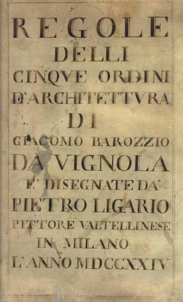 - NOTIZIE STORICO CRITICHE Il volume, di rilegautra moderna, raccoglie 28 fogli numerati da I a XXX, con l'omissione dei fogli XVIII e XXIII. Le tavole corrispondono anche nell'ordine alle edizioni a stampa del trattato, le due mancanti corrispondono a quelle dedicate al capitello ionico e al capitello corinzio. Le scritte sono fedeli nei dati essenziali a quelle delle edizioni a stampa, tradotte in terza persona. Come denunciato dal frontespizio, Pietro si dedicò alla trascrizione delle tavole del Vignola, secondo la più tradizionale pratica accademica, a Milano nel 1724, quando già da molti anni si era dedicato alla professione. Il volume è menzionato nell'Inventario 1735-1737 (c. 44) tra le "Cose diverse apartenenti alla Pittura", come "Vignola d'Architettura da me dissegnato".