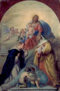 - NOTIZIE STORICO CRITICHE Il bozzetto, che ripete fedelmente il disegno schedato al N.I.L. 621, è certamente quello della Beata Vergine del Rosario dipinta da Angelo Ligari nel 1859 per la parrocchiale di Piateda, con l'aggiunta del piccolo particolare del rosario porto a S.Domenico da un angioletto. La data 1859 del quadro è presumibile anche per il presente bozzetto.