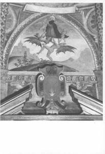 Due grossi demoni, dal corpo bruno, e grandi ali azzurre, assalgono S. Antonio - con manto scuro sul saio color senape - che viene trasportato in cielo dagli angeli. Sul fondo, modulato in toni di verde e bruno chiaro, si susseguono morbidi declivi ed è delineata a sinistra la sagoma di un castello. L'iscrizione sottostante, retta da due angeli e dipinta in monocromo grigio, è nascosta dallo stemma del dossale ligneo dell'altare.