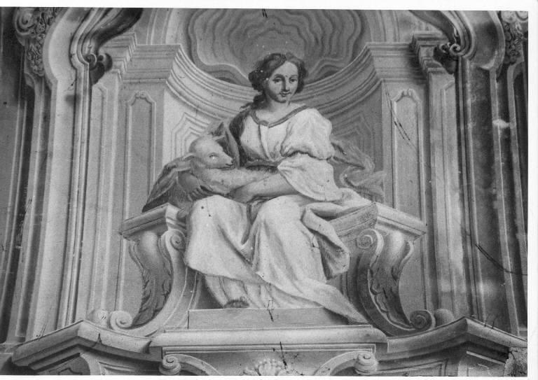 La lunetta di sinistra è profilata da una cornice sagomata in toni di grigio e beige su fondo giallo. Nella nicchia è seduta una figura allegorica che tiene in braccio un agnello, dipinta in toni di grigio e rosa, con veste rosa e azzurra.