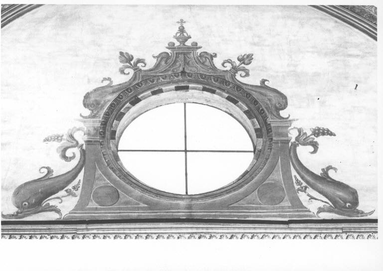 La decorazione a fasce bicrome e fusaruole in monocromo grigio appartiene alla decorazione originaria. Le incorniciature esterne presentano quattro delfini, dipinti in rosso e giallo e forse sono posteriori. S