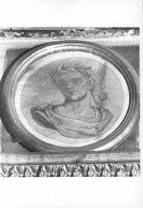 Testa virile di profilo con corona dipinti in monocromo grigio. Cornice lignea dorata.