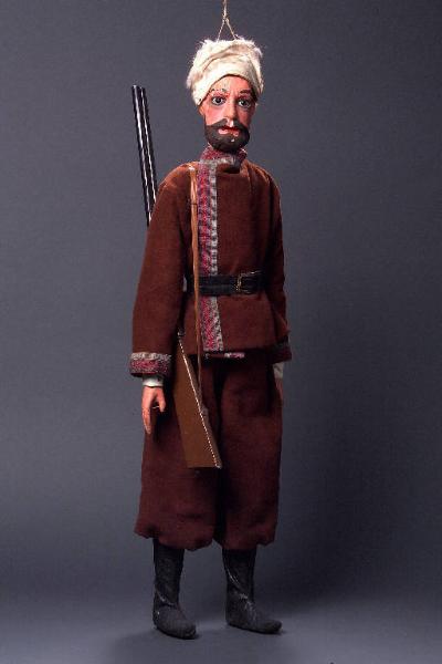 Testa di legno dipinta a olio, colorito roseo; colore scrostato sulla fronte e sulla guancia destra. Sopracciglia e profilo degli occhi marrone; occhi di vetro neri. Barba e baffi intagliati e dipinti di marrone. Labbra rosse; orecchie intagliate. Alla testa è incollato il colbacco in pelliccia di lapin bianca, quasi completamente caduta. La calotta è di tessuto rosso. Giacca di fustagno marrone bordata all'abbottonatura, al collo e ai polsi con passamaneria grigia e rossa. In vita una cintura di pelle marrone con fibbia metallica dorata. Alla spalla destra è inchiodato il fucile con calcio di legno, cane, grilletto e canne di metallo. La fascia che regge il fucile è di plastica. Pantaloni di fustagno marone arricciati alle giocchia. Stivali di pelle nera. Tronco di legno articolato al bacino. Braccia di stoffa imbottita alle quali sono inchiodate le mani di legno dipinto. In entrambe le mani il dito pollice è separato dalle altre dita con un chiodino. (continua in OSS)