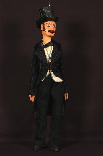 Testa di legno dipinta a olio, colorito chiaro. Baffi e basette intagliati e dipinti di marrone scuro come i capelli. Sopracciglia, profilo degli occhi e occhi dipinti di marrone scuro. Labbra rosse; orecchie intagliate. Alla testa è fissato il cilindro di cartone dipinto di nero, sulla sommità un foro permette il passaggio dell'eventuale ferro. Il corpo è di legno; le braccia di stoffa, alle quali sono inchiodate le mani di legno dipinto, provviste di foro nel palmo per l'aggancio dei fili. Gambe di legno articolate al bacino e con snodo alle ginocchia. Giacca di tessuto di lana blu con righe longitudinali azzurre, collo di velluto blu, fodera di tela viola. Sul davanti sono cuciti quattro bottoni di plastica blu. La stoffa è deteriorata sui revers, sulla manica sinistra e sono visibili dei rammendi. Altri buchi nel tessuto sono visibili sulle code, ai polsi, ai gomiti. (continua in OSS)