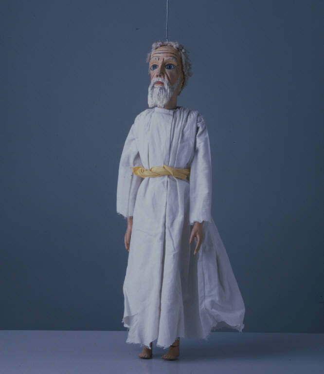 Testa di legno dipinta a olio, colorito chiaro; sopracciglia dipinte di bianco; profilo degli occhi dipinto di nero come le rughe. Barba, baffi e capelli intagliati e dipinti di bianco. Ai capelli intagliati è stata sovrapposta una parrucca bianca. Occhi di vetro grigi, labbra rosse; orecchie intagliate. Il lato sinistro della testa presenta una profonda spaccatura nel legno. Il busto è di legno, privo dell'articolazione al bacino. Le braccia sono di stoffa imbottita e ad esse sono inchiodate le mani dipinte di rosa. Le gambe sono di legno, articolate al bacino e provviste dello snodo alle ginocchia. Lunga tunica di tela bianca, con fusciacca in vita dello stesso tessuto. La tunica è arricciata sulle spalle e inchiodata al collo. I piedi di legno, un tempo mobili, ora fissi, sono intagliati e lasciati nudi.