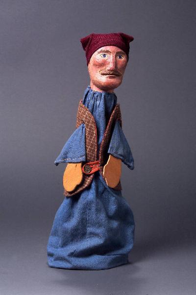 Berretto di velluto bordeaux a coste, inchiodato alla testa in tre punti, cucito nella parte posteriore a mano, con filo di cotone beige. Testa di legno dipinta a olio magro: incarnato rosa spento, capelli, sopracciglia e baffi (intagliati) marroni, occhi blu profilati in marrone. La base del collo è forata da fori passanti attraverso i quali scorre dello spago sottile che fissa il buratto al collo. Gilet in tessuto di lana marrone a quadrettini, con fodera color ruggine; orlo a vista alle maniche; chiuso sul davanti da asola e bottone verde. Buratto di tela blu di cotone; lo spago che lo fissa al collo è legato posteriormente. All'orlo è cucito un cordoncino di cuoio per appendere il burattino. Mani di legno (compensato) non dipinto, forate ai polsi con fori passanti attraverso i quali scorre il filo che le fissa alle maniche del buratto.