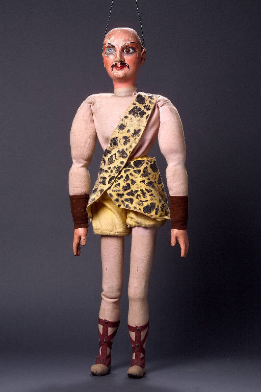 Testa di legno scavata nella parte posteriore e poi richiusa (mediante colla e chiodi). Dipintura ad olio: incarnato roseo, labbra rosse, baffi spioventi dipinti in marrone, sopracciglia e ciglia nere. Scrostature di colore estese e assai evidenti, poiché lasciano apparire il bianco sottostante, diffuse soprattutto su fronte, sopracciglia, naso e mento; ai lati e sulla nuca vi è una lunga abrasione circolare, che collega le due tempie e lascia scoperto il legno grezzo. Gli occhi, di vetro, sono di colore diverso: il sinistro è marrone, il destro, aggiunto in seguito (probabilmente a causa di una rottura dell'originale), è fissato con cera ed è notevolmente storto (verso l'alto); la pupilla è azzurra. Ai lati, sopra le orecchie, sono infisse due cambrette per il fissaggio dei relativi fili. Attualmente la testa è priva di capelli, ma sono visibili molti fori dovuti alle inchiodature di parrucche precedenti. (continua in OSS)