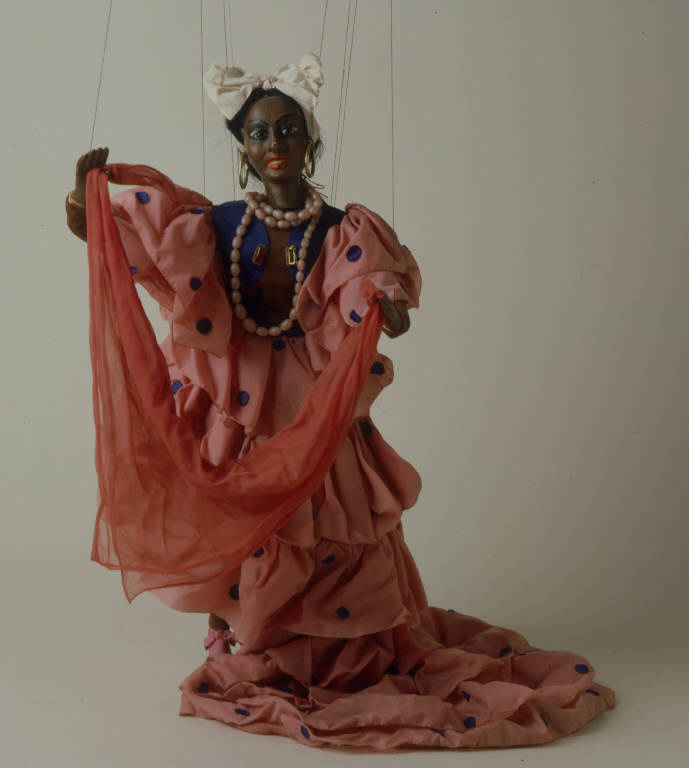 Testa di legno dipinta a olio, colorito bruno; sopracciglia, ciglia e profilo degli occhi dipinti di nero; occhi di vetro marrone. Labbra rosse leggermente socchiuse; parrucca nera di capelli veri inchiodata alla testa. Alle orecchie, mediante due cambrette, sono fissati due orecchini tondi, di metallo. Sulla testa è annodato un nastro di seta rosa. Tronco e bacino sono di legno articolati con una fascia di tela inchiodata alle due parti. Le braccia sono di stoffa imbottita e ad esse sono inchiodate le mani di legno dipinte di bruno. Le gambe sono di legno, articolate al bacino con stoffa imbottita e provviste di snodo alle ginocchia. Il busto è ricoperto di una sottile maglina marrone, che ricopre anche le braccia e simula la pelle nuda. (continua in OSS)