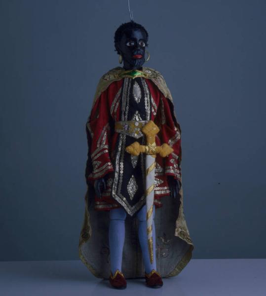 Testa di legno dipinta a olio, colorito bruno; occhi di vetro marrone; labbra rosse; baffi e pizzetto intaglati. Orecchie intagliate alle quali sono fissati due orecchini circolari di ottone. Parrucca nera di lana bouclé, inchiodata alla testa. Mantello di seta verde con fodera di tela beige, fissato al collo con una fibbia di cartoncino, ricoperta di stagnola verde e bordata con nastro laminato oro. Il mantello è riccamente decorato con passamaneria oro e paillettes dorate disposte longitudinalmente sul retro, e con ricami di filo laminato oro, argento e rosso. La stessa decorazione di paillettes e passamaneria si ripete all'orlo. Veste di tessuto di lana rossa con una fascia longitudinale di tessuto di lana nera, cucita al collo della veste. (continua in OSS)