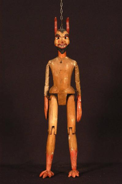 Testa di legno dipinta a olio, colorito giallastro. Il ciuffo di capelli, le sopracciglia, i denti e la barba sono intagliati; le corna sono intagliate e incastrate nella testa. Capelli, sopracciglia e barba sono dipinti di nero; le labbra sono rosse come le corna, il profilo degli occhi e gli intagli sulle guance, nonché la cavità nasale. I denti sono bianchi come parte degli occhi; questi hanno un incavo per le pupille dipinto di nero. Alle tempie sono fissati due chiodini per il movimento a bilanciere. Sulla nuca è inchiodato un pezzo di cuoio. La testa è articolata al corpo mediante una vite che attraversa il petto. Alle spalle sono inchiodate le braccia di stoffa a cui sono inchiodate le mani di legno a forma di artiglio. Alla mano destra è fissato un anellino di ferro per il passaggio dei fili. Il bacino è privo di articoazione e le gambe sono fissate mediante fil di ferro. (continua in OSS)
