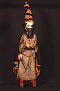 Testa di cartapesta dipinta a olio, colorito chiaro, colore rovinatissimo. Sopracciglia e profilo degli occhi nero; occhi di vetro. Labbra rosse, barba e baffi neri. Parrucca di capelli sintetici neri. Alla testa è fissato un cappello a cono di cartoncino ricoperto di tessuto rosso, bordato con traversino bianco e passamaneria verde e decorato con striscia di velluto nero. Alle spalle e inchiodato il mantello di tessuto nero e fodera marrone, bordato e decorato con traversino color ruggine. Collare di velluto nero bordato di rosso. Veste di tessuto viola con fodera blu; ai polsi decorazione di pizzo bianco e rosso che si ripete all'orlo. In vita una cintura di tessuto nero bordata con traversino color ruggine. Brache di tessuto rosso; scarpe con la punta rivolta verso l'alto di tessuto viola, bordate con traversino rosso. (continua in OSS)