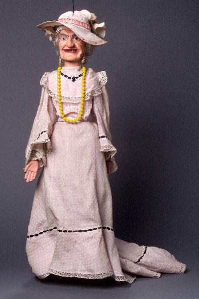 Testa di legno dipinta a olio, colorito chiaro. Sopracciglia grigie; profilo degli occhi nero a puntini; occhi marrone e nero dipinti e verniciati. Labbra socchiuse color rosso mattone come gli incavi delle guance e le rughe. Neo dipinto sulla guancia sinistra. Parrucca di capelli sintetici bianchi. Alle orecchie sono fissati gli orecchini di metallo dorato e traforato a forma conica; sono vuoti all'interno e sono fissati con due spilli. Alla testa è fissato il cappello di tela bianca inamidata, bordato e decorato con nastro di seta rosa con pois rossi ricamati. Sulla falda sinistra sono fissati dei fiori di stoffa bianca con foglie verdi (delle rose). Sotto la falda sinistra sono cuciti altri fiori di stoffa, bianca e colorata, con una foglia verde. Al collo una collana di plastica gialla. Il busto è di legno con un'imbottitura di polistirolo; le braccia sono di stoffa (velluto nero) e ad esse sono inchiodate le mani di legno dipinte di rosa. (continua in OSS)
