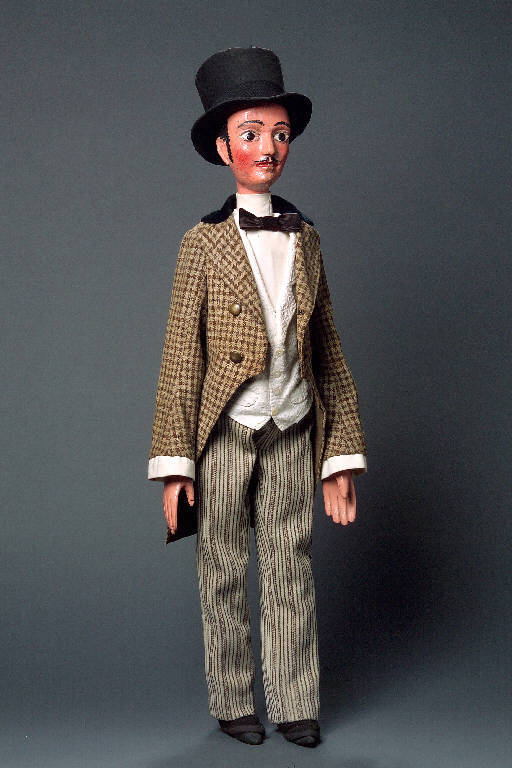 Testa di legno dipinta a olio, colorito roseo; capelli e baffi neri; sopracciglia, profilo degli occhi e occhi dipinti di nero. Labbra rosse; orecchie intagliate. Alla testa è inchiodato un cilindro di cartone ricoperto di tessuto nero con fascia di gros grain nero. Colletto di tela bianca separato dalla camicia, pure di tela bianca. Papillon di seta blu completamente sfaldato. Gilet di tessuto bianco a pois viola con quattro bottoni di metallo dorato e con disegni floreali stampati nelle colorazioni: rosso/ oro, bianco/ verde/ oro, marrone/ verde/ oro, avorio/ verde/ oro. Sul davanti sono applicate due finte tasche; il gilet è bordato con nastro di seta avorio. Giacca tight di tessuto quadrettato (marrone e bianco) con fodera di tela marrone e colletto di velluto blu. Sul davanti quattro bottoni marroni (uno mancante). (continua in OSS)