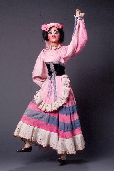 Testa di legno dipinta a olio, colorito roseo; sopracciglia, ciglia e profilo degli occhi dipinti di nero. Occhi di vetro azzurri; Labbra rosse, socchiuse. Colore piuttosto rovinato sulla punta del naso e sul mento. Parrucca nera di capelli veri, acconciati con due chignon laterali. Tronco e bacino di legno articolati con fascia di tela inchiodata alle due parti. Braccia di stoffa imbottita alle quali sono inchiodate le mani di legno dipinte di rosa. Gambe di legno articolate al bacino con stoffa imbottita e provviste dello snodo alle ginocchia. Sulla testa è fissata un'acconciatura di foggia popolare di seta rosa. La veste è di seta rosa con ruches di pizzo bianco, con ricami floreali rosa, che ornano collo, polsi e orlo. Corpetto di velluto nero bordato con nastrino blu che lo chiude con un fiocco. Lo stesso nastrino è fissato ai polsi con un fiocco e in parte pendente. (continua in OSS)