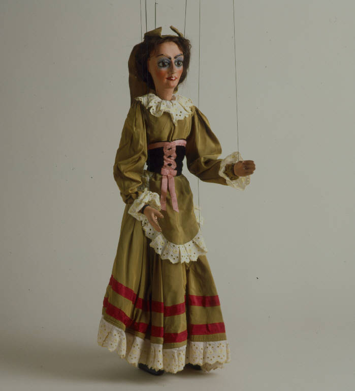 Testa di legno dipinta a olio, incarnato roseo; sopracciglia, ciglia e profilo degli occhi dipinti marrone scuro. Occhi di vetro marrone; ombreggiatura viola intorno agli occhi. Labbra rosse leggermente socchiuse; parrucca di capelli veri castani. Ai capelli è fissata un'acconciatura di foggia popolare, di seta verde piuttosto consunta e con rammendi. Tronco e bacino di legno articolati mediante fascia di tela inchiodata alle due parti. Braccia di stoffa imbottita alle quali sono inchiodate le mani di legno dipinte di rosa; colore scrostato alle dita, come sulle sopracciglia. Le gambe sono di legno, articolate al bacino mediante stoffa imbottita e provviste dello snodo alle ginocchia. Veste di seta verde con ruches di pizzo con ricami floreali gialli al collo e ai polsi nonché all'orlo. (continua in OSS)