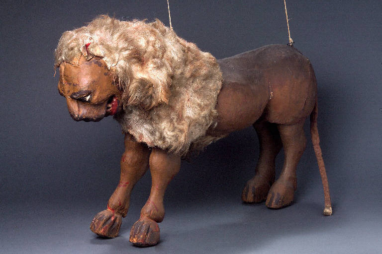 Testa e corpo di cartapesta dipinta a tempera marrone. Criniera di pelo grigio, orecchie di pelle. Occhi dipinti; bocca aperta con denti visibili e dipinti di bianco. Zampe di legno articolate al corpo, prive dello snodo alle ginocchia. Unghie dipinte di nero.