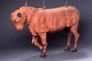 Testa di legno dipinta marrone, articolata al collo, a sua volta articolato al corpo anch'esso di legno dipinto marrone. Occhi di vetro azzurri. Le zampe anteriori sono articolate al corpo e snodate al ginocchio, le zampe posteriori sono rigide. Codino di stoffa con ciuffo di peli terminale. Gli zoccoli sono dipinti di nero.