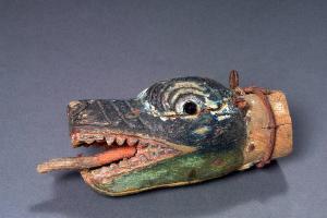 Testa di legno dipinta a olio magro blu e verde; spennellature di bianco sulla testa e sugli occhi. Naso, rughe e occhi intagliati. Globo oculare di vetro sfaccettato scuro. Denti intagliati nella bocca aperta, dipinta di rosso. I denti sono dipinti di bianco sbiadito. La lingua è di legno, dipinta di rosso sbiadito e inchiodata nella bocca. Alla base del collo che non è dipinto, è fissato con cambrette, del fil di ferro piuttosto spesso, nonché una vite a occhiello. Chiodi sono infissi lungo la base del collo. Sulla sommità della testa c'è una profonda scalfittura, e longitudinalmente una spaccatura nel legno.