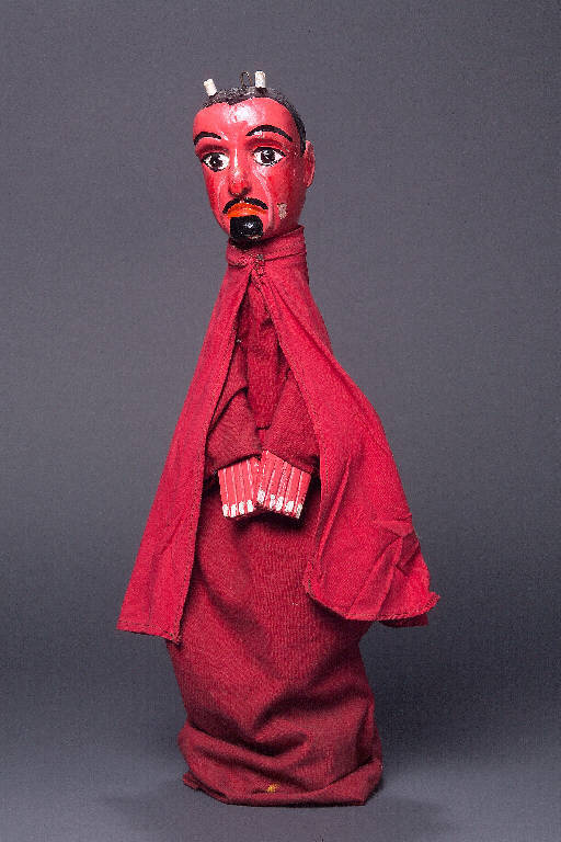 Testa di legno dipinta con vernice a smalto su base di stucco, di colore rosso acceso. Sulla sommità della fronte due cornetti. Capelli, sopracciglia, ciglia, occhi, baffi e pizzetto neri, orecchie intagliate con lumeggiature rosse, labbra arancio, guance e naso rossi, fosse nasali rosso cupo. Scrostature di colore sull'arcata sopracciliare sinistra, sul naso, sul mento; colore sollevato sulla guancia sinistra. Tra i due cornetti sono visibili tracce di fibra un tempo inchiodata, (forse un ciuffo di capelli). Mantello di cotone rosso, inchiodato al collo. Vestito dello stesso tessuto rosso, inchiodato al collo posteriormente; all'attaccatura delle maniche la stoffa è scucita; le maniche sono inchiodate ai polsi. Buratto in tessuto di lana verde inchiodato al collo. Mani di legno inchiodate al buratto, dipinte come la testa, con dita intagliate e unghie segnate di bianco.