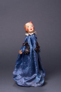Testa di cartapesta con preparazione di stucco colorato e dipintura a olio magro; capelli modellati e dipinti di giallo con striature marrone, pompon sul lato sinistro della testa. Incarnato roseo guance labbra e narici rosse; sopracciglia marrone, ciglia nere, occhi azzurri con pupilla nera. Abito di tessuto blu con orlo fatto a mano e fori nel tessuto. Al collo è cucita una ruche di pizzo bianco; maniche decorate con tulle nero ricamato con una sottile catenina dorata. Polsi arricciati intorno alle mani di cartoncino marrone (quella sinistra è mancante). L'abito è incollato al collo ed ha un vistoso strappo nella parte posteriore.