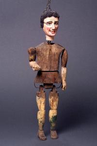 Testa di legno dipinta ad olio, colorito roseo, bocca in attaggiamento sorridente; capelli scolpiti e dipinti di scuro. Le pupille sono forate probabilaente perché ospitavano pupille di vetro. La testa è articolata al corpo mediante vite a occhiello. Il busto è di legno, un tempo articolato in tronco e bacino, odiernamente reso rigido. Alle spalle, mediante striscia di cuoio, è inchiodato il braccio sinistro che presenta tracce di colore chiaro; il braccio destro, piegato ad angolo retto e rigido, è articolato alla spalla mediante chiodo passante. Le gambe sono fissate al bacino con fil di ferro e sono articolate al ginocchio. Presentano tracce di colore giallo.