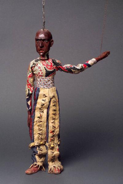 Testa di legno dipinta ad olio color bruno, occhi di vetro, bocca rossa articolata. Capelli sottilmente scolpiti; posteriormente incavo nella testa mascherato da tassello di legno (per l'articolazione della bocca) fissato con striscia di cuoio e due viti. Colletto di tessuto stampato uguale alla casacca, maniche arricciate al gomito e polsino alto di tessuto stampato bianco, blu e rosso. Mani di legno. Fascia in vita di cotone stampato millerighe marrone e azzurro. Pantaloni di tela blu a strisce rosse, viola e gialle cucite e sovrapposte; all'altezza del ginocchio striscia orizzontale gialla con corallini gialli e decori a "X" cuciti con filo nero. Frangia di pelle che borda i pantaloni. Scarpe di pelle rossa, sbiadita, con suola di cartone inchiodata.