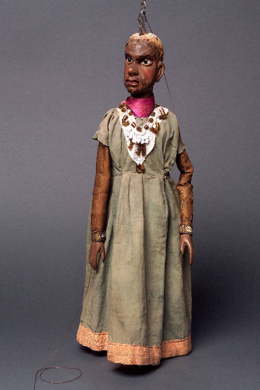 Testa di legno dipinta a olio di colorito bruno, priva di capelli; occhi di vetro, bocca articolata. La testa presenta posteriormente un incavo longitudinale praticato per l'articolazione della bocca. Braccia di stoffa imbottita alle quali sono fissate le mani di legno. Pure di legno sono corpo e gambe. Alla gamba sninistra manca il piede, alla caviglia destra è fissato un anello di metallo con due piccole borchie. Intorno al collo è cucito un nastrino laminato oro sormontato da un altro di raso e velluto rosso, annodato e cucito posteriormente. Abito di tela verde con colletto in tessuto chiaro ornato con piccoli tubicini di vetro colorato e bianco. L'orlo della veste è bordato di arancio. Internamente alla veste sono visibili buchi e rattoppi, come sul braccio sinistro.