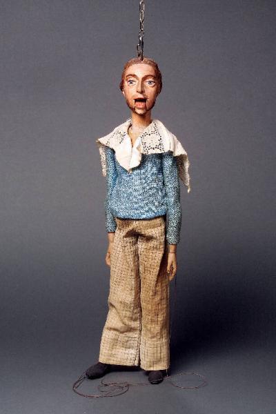 Testa di legno dipinta a olio con capelli barba intagliati e dipinti di marrone, come le sopracciglia. Occhi di vetro azzurri; bocca articolata con denti intagliati; labbra rosa. Posteriormente profondo incavo nella testa che lascia vedere il meccanismo della bocca. Corpo di legno, privo dell'articolazione in vita; braccia di stoffa con inchiodate le mani di legno; quella destra leggermente contatta, la sinistra aperta. Gambe di legno con articolazione al ginocchio; piedi dipinti di nero e intagliati come scarpe. Il vestito è formato da casacca di tessuto azzurro con largo collo di pizzo bianco; pantaloni di tela chiara a quadrettini profilati marrone.