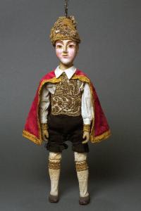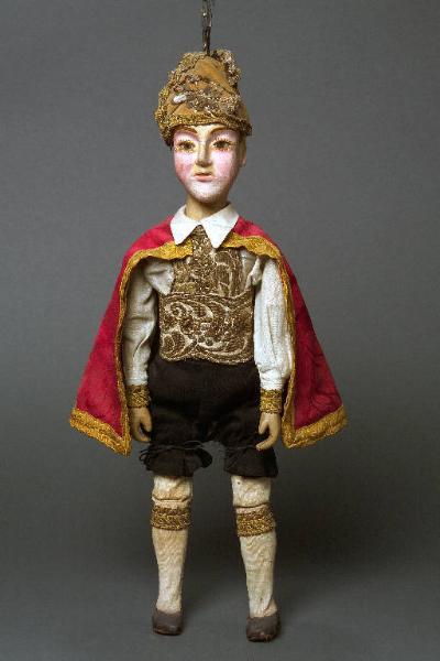 Cappello a cono di velluto oro con decorazioni di nastrino laminato oro e paillettes oro, inchiodato alla testa di legno, probabilmente con rivestimento in cartapesta. La testa è dipinta ad olio, di colorito chiaro, capelli e sopraciglia biondi, guance e labbra rosa, occhi dpinti e incassati sotto la suprficie del volto. Mantellina di broccatello rosso bordata con nastrino operato giallo; camicia di tela bianca con colletto; panciotto di broccato bianco e oro e piccole paillettes. Pantaloni corti di tela nera stretti alle cosce con cordoncino nero (scuciti al cavallo); calze di tela bianca con giarrettiere di passamaneria oro; scarpe marroni con suola di cartone inchiodato. Corpo in legno snodato.