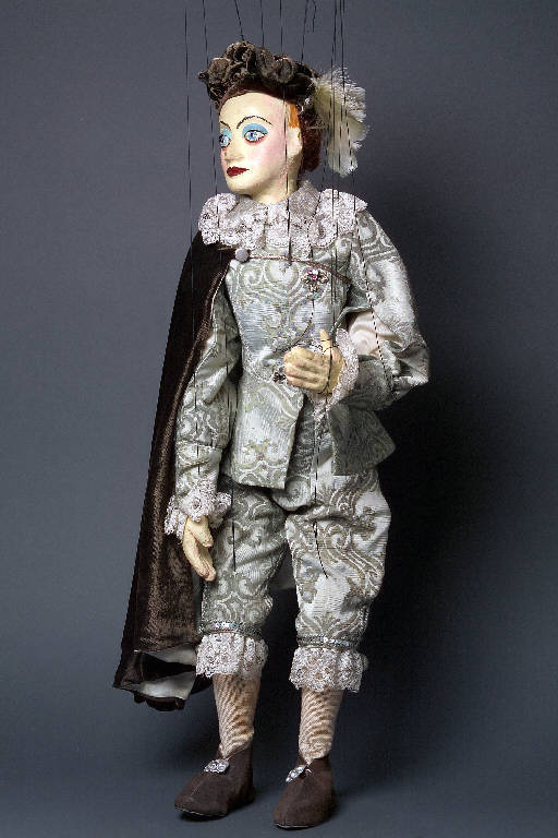 Testa di pasta di legno dipinta con colori acrilici; colorito chiaro, guance rosee, labbra rosee. Palpebre dipinte di azzurro; occhi azzurri profilati di nero. Sopracciglia nere. Capelli sintetici castani. Alla testa è fissato un berretto di velluto marrone, decorato sul lato sinistro con un bottone di plastica argento, sfaccettato, e da piume grigio verdi. Alle tempie sono fissate due viti a occhiello per consentire l'aggancio dei fili. Il corpo è di legno, busto e bacino sono articolati tra loro mediante una fascia di stoffa. Le braccia sono di stoffa, inchiodate alle spalle; le mani sono di pasta di legno. Le gambe sono di legno con articolazione alle ginocchia. Mantello di velluto marrone con fodera di raso bianco, appoggiato sulla spalla destra e fissato con un cordoncino d'argento legato a due bottoni argentati. (continua in OSS)