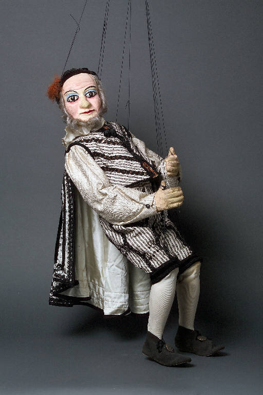 Testa di pasta di legno dipinta con colori acrilici, colorito roseo. Sopracciglia, profilo degli occhi e occhi dipinti di nero; ombreggiatura azzurra sulle palpebre. Capelli e barba sintetici di colore grigio. Alla testa è inchiodato un berretto di velluto nero con decorazione in passamaneria nera e piuma marrone sul lato destro. Gorgiera di tessuto bianco. Giacca di tessuto a righe bianche e nere trasversali con inserti di passamaneria nera e paillettes marroni disposte trasversalmente. Un cordoncino nero orla un ricamo di filo marrone e paillettes al collo e scende longitudinalmente fino a orlarne un altro posto in basso e tutta la giacca. Le maniche sono bordate alle spalle con passamaneria nera e sono di tessuto operato bianco con piccoli ricami neri. (continua in OSS)