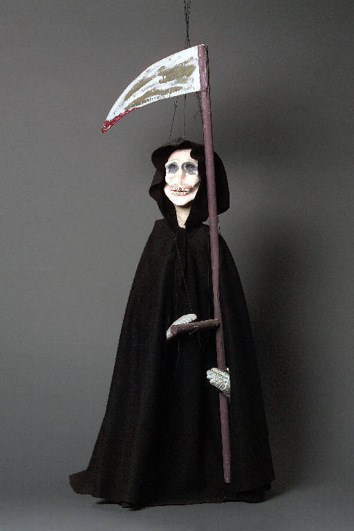 Testa di pasta di legno dipinta con colori acrilici, colorito bianco con sfumature grigie. Occhiaie cave, denti modellati e profilati di rosso scuro. La marionetta indossa una lunga veste di panno nero e un mantello con cappuccio (domino) annodato alla gola, sempre di panno nero. Alle mani è fissata la falce di legno, con bastone dipinto di grigio e la lama dipinta grigio più chiaro, con striature d'argento e con la punta sporca di rosso. Il corpo è di legno, busto e bacino sono articolati tra loro mediante una fascia di stoffa. Le braccia sono di stoffa, ad esse sono inchiodate le mani di pasta di legno scheletriche e dipinte di grigio. Le gambe sono di legno, articolate al bacino e provviste di snodo alle ginocchia.