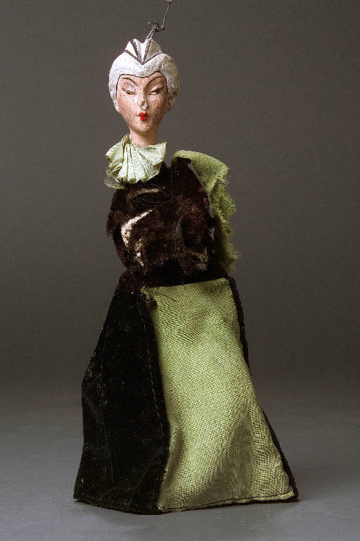 Testa di terracotta di fine modellato con tratti del volto ben caratterizzati; busto di terracotta; braccia e gambe mancanti. La testa ha incarnato roseo, labbra rosse, sopracciglia e occhi a mandorla profilati di nero; capelli bianchi. Al collo è fissata una gorgiera di seta verde; l'abito è di velluto nero con inserto verde sul davanti e reca cucita la manica sinistra. L'abito è strappato in più punti.