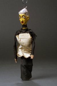 Testa di terracotta can tratti del volto fortemente caratterizzati; busto di terracotta come le mani; le gambe mancano. Il volto è dipinto di giallo, le labbra rosse, sopracciglia e il profilo degli occhi neri. Collarino di seta nera cucito al collo; abito di tessuto nero con maniche alle qual i sono incollate le mani. Grembiule di cotone bianco con bordo frastagliato. Nella testa è fissato un gancio per l'attacco del Ferro.