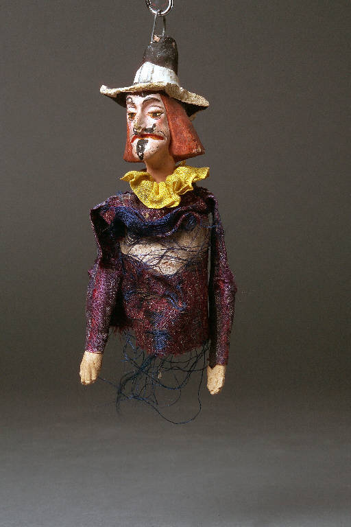 Testa di terracotta con tratti del volto fortemente caratterizzati; busto di terracotta come le mani; le gambe mancano. Il volto ha colorito roseo, con labbra rosse, sopracciglia, profilo degli occhi, baffi e pizzetto neri. Capelli a caschetto dipinti di marrone; cappello di foggia seicentesca nero con fascia bianca e fibbia argento, tutto modellato in terracotta. La bocca è atteggiata in una smorfia. Al collo ruche di nastro giallo; casacca di seta viola e blu con maniche alle qual i sono incollate le mani.