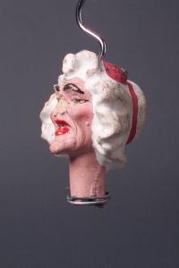Testa di terracotta con incarnato roseo, labbra rosse, sopracciglia e profilo degli occhi neri; cuffia bianca modellata con ruche che incornicia il volto e fiocco rosso alla sommità. Naso spezzato. La testa è attraversata in senso longitudinale da fil di ferro.