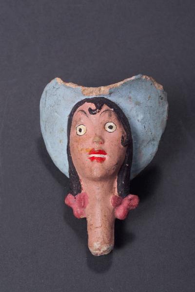 Testa di terracotta con colorito bruno, capelli, sopracciglia e profilo degli occhi nero; labbra rosse aperte in un sorriso che lascia intravedere i denti bianchi. I capelli sono legati in due treccie chiuse da nastri rosa modellati. Il cappello è modellato e dipinto di azzurro con una fascia bianca. La testa è attraversata in senso longitudinale da fil di ferro.