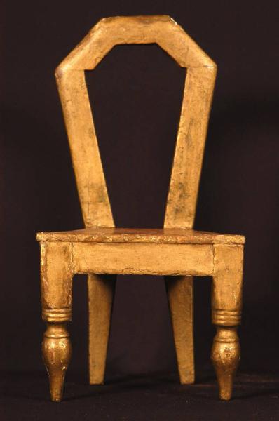 Attrezzeria per marionette: sedia di legno con gambe tornite anteriormente, a sezione quadrata quelle posteriori. Poggiapiedi di legno a sezione quadrata; schienale con due montanti e una spalliera ricoperta con finta pelle nera, imbottita e fissata con borchie metalliche. La seduta è ancora in finta pelle nera, l'imbottitura è fatta con stoffa e nella parte interna sono visibili delle lamine di metallo incrociate tra loro che fungono da molle. Il legno è dipinto marrone e verniciato.