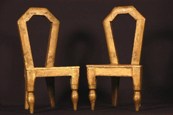 Attrezzeria per marionette: due sedie di legno con gambe tornite; seduta di forma trapezoidale; schienale di forma quadrangolare cavo., imbottita e fissata con borchie metalliche. Le gambe posteriori hanno sezione quadrata. Le sedie sono dipinte con vernice dorata; la seduta è abbondantemente stuccata e poi dipinta di giallo e successivamente verniciata.