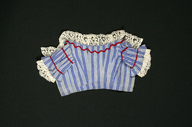 Il corpetto, foderato con cotone bianco stampato a fiorellini rossi, è di cotone azzurro con righe verticali blu. Presenta una decorazione di nastrino rosso alle maniche e sul petto e scollatura e polsi bordati di pizzo di cotone bianco.