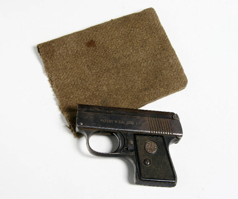 Pistola scacciacani di metallo con calcio squadrato e placche di plastica nera avvitate. Marchio rotondo EM-GE con lettere nere su fondo giallo, stampato su ambo i lati. Sulla canna è inciso "PATENT* CAL 320". Dotata di sicura e caricatore, è contenuta in un sacchetto di lana marrone.